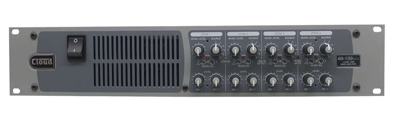 The new Cloud Electronics 46-120mk2 four zone mixer amp offers 4 x 120 watts output 4Ω/8Ω/70V/100V. Power sharing is available, enabling 240 watts total output to be distributed as required across Zones 1 & 2, and Zones 3 & 4.