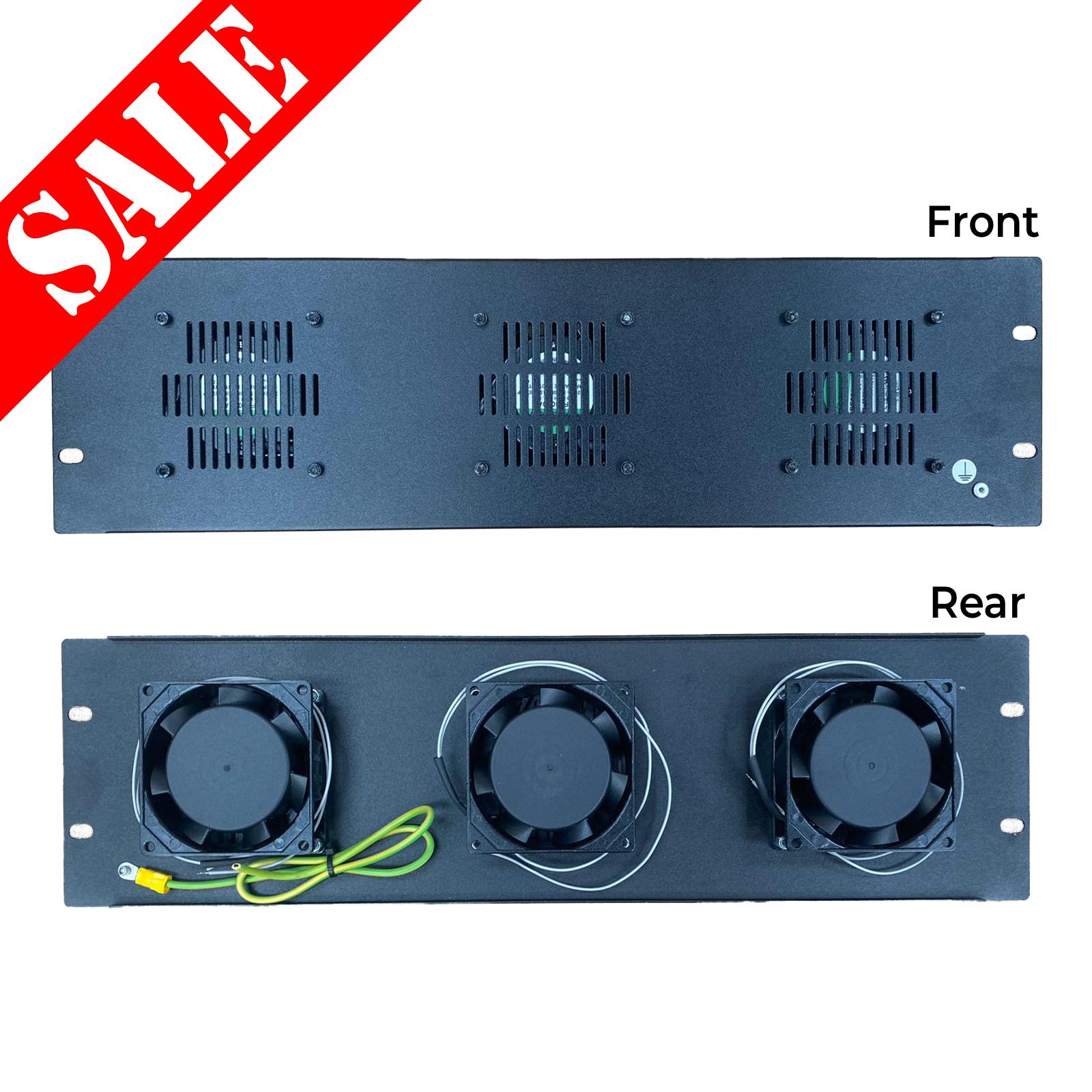 The 3U, 19" vented rack panel is fitted with three 230V axial fans with 80mm ventilation slots.