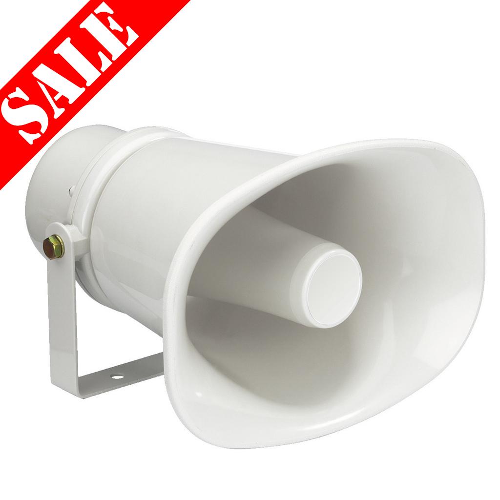 The Monacor IT-115 weatherproof horn speaker is rated at 15 watts RMS and suitable only for 100 Volt line commercial audio speaker lines.