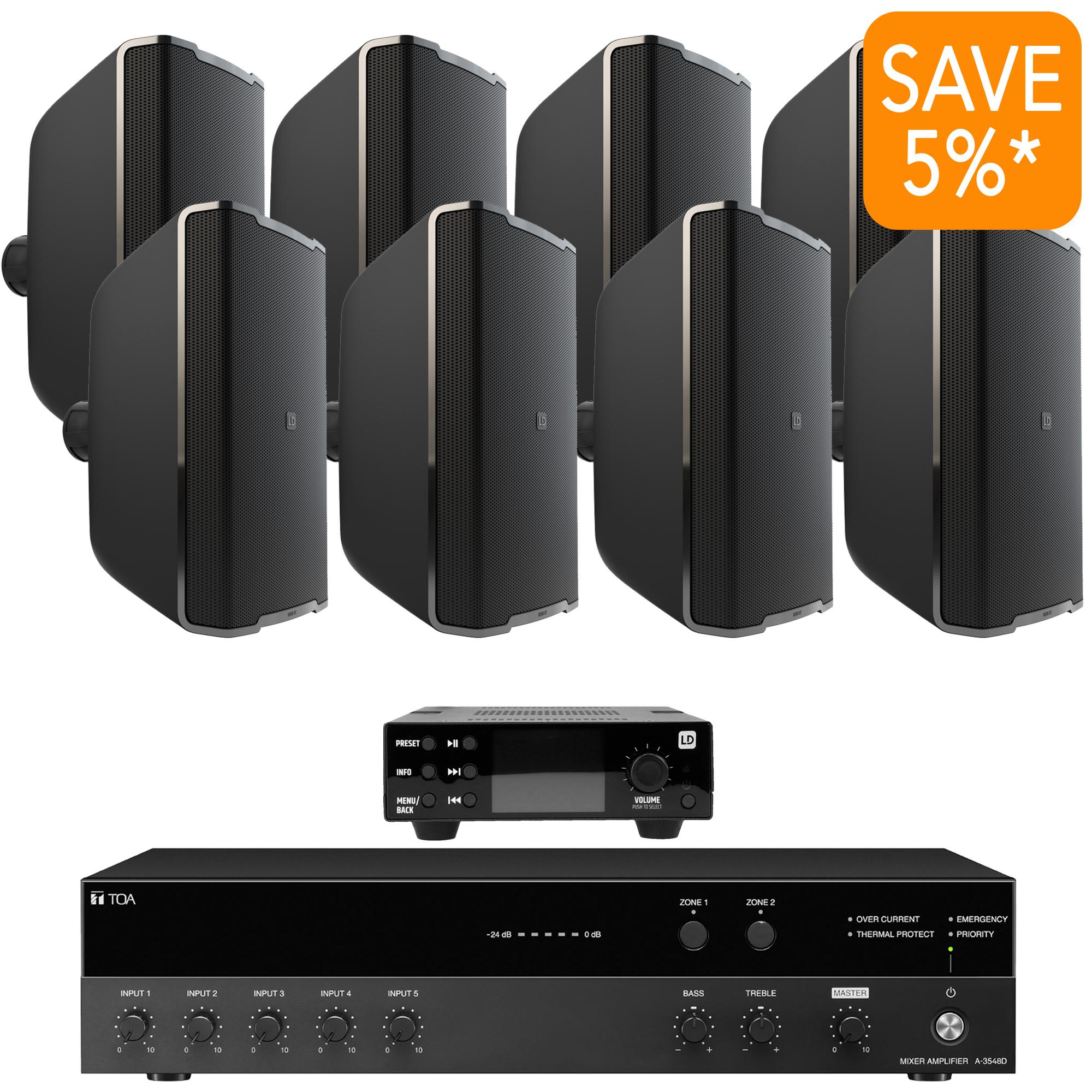 The package includes the TOA A-3548D digital mixer amplifer, the versatile LD Systems RSMP music streamer & eight LD Systems DQOR8T cabinet loudspeakers in black, tapped at 30 watts.