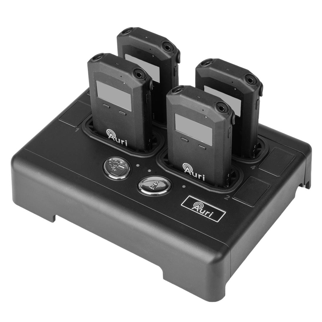 Each charging slot in the AURI D4 docking station features a tension lock to ensure secure charging connectivity, and each slot can be used to store ID cards or other items that are exchanged for a receiver whilst in use.