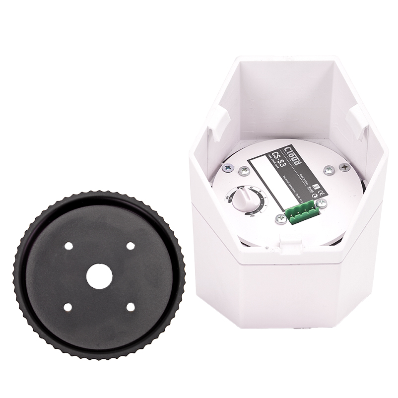The Cloud Electronics CS-S3W surface mount speaker is a 3" full range hexagonal loudspeaker rated at 16 watts on 100 volt line / 16 ohm music systems. White finish.