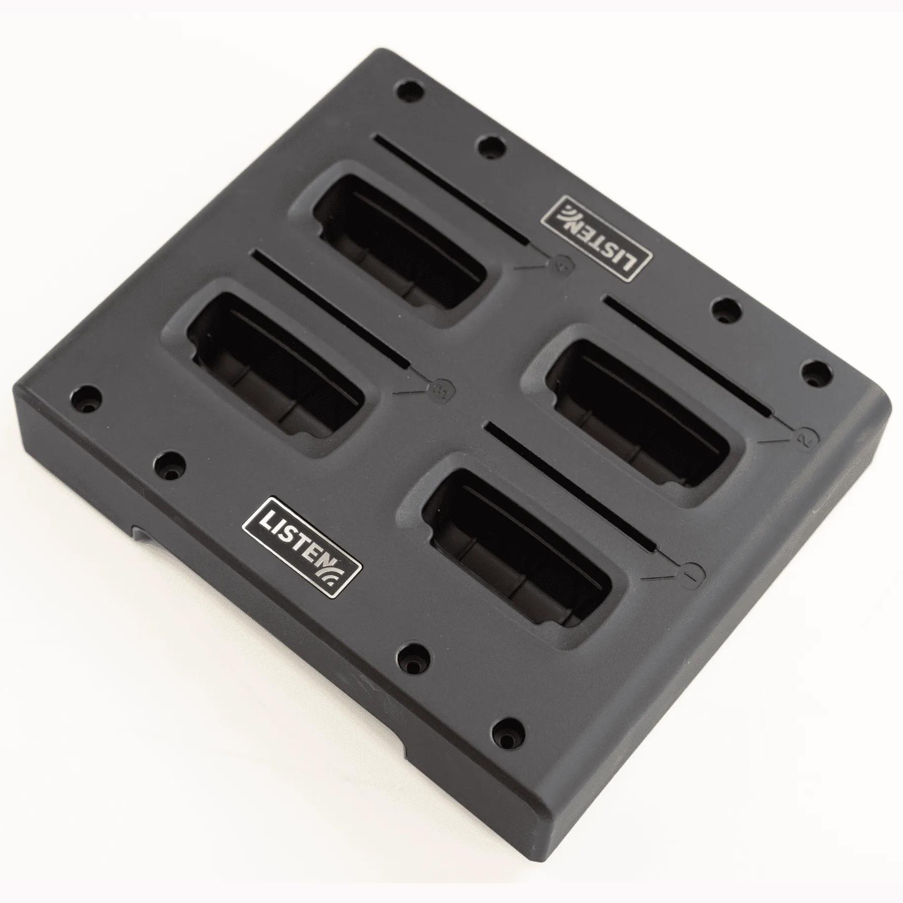 The LA-384 intelligent 4-bay charging tray enables up to four individual Listen iDSP (Intelligent Digital Signal Processing) infrared receivers to be charged, stored, dispensed and collected in one handy unit.