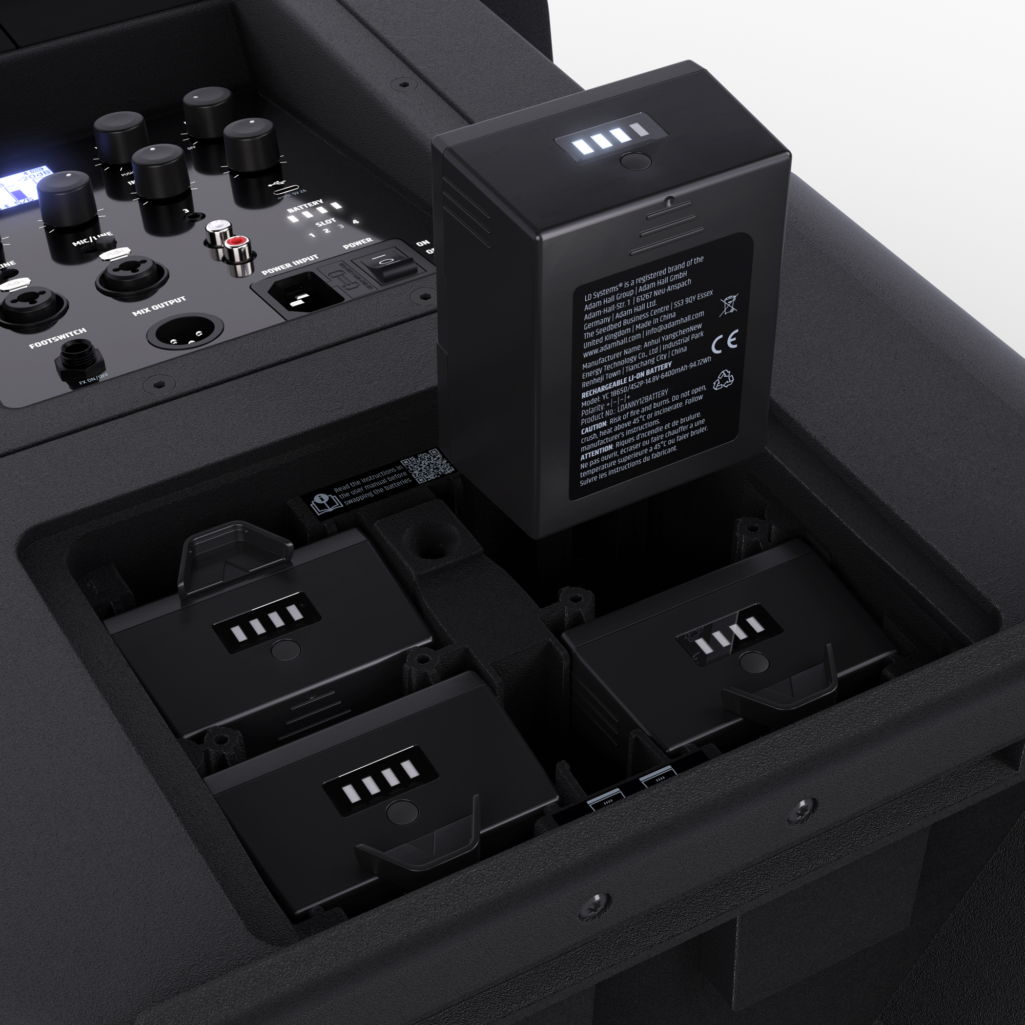 On the outside of the speaker, the 4-LED status display provides a quick overview of the current charge level at all times. When the ANNY® 12 is connected to the mains, all batteries inside the unit are charged automatically. Without an audio signal, they are charged to up to 80% in just 2 hours.