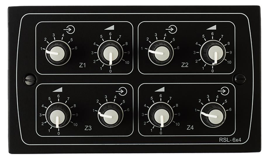 The Cloud Electronics RSL-6x4B multizone remote level control and source selector allows control of 4 independent pairs of volume control and music source selection switches.