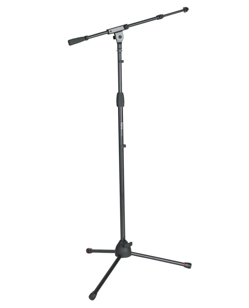 Gator Frameworks floor standing microphone stand with collapsible tripod base and extending boom arm. Height adjustable with twist clutch.