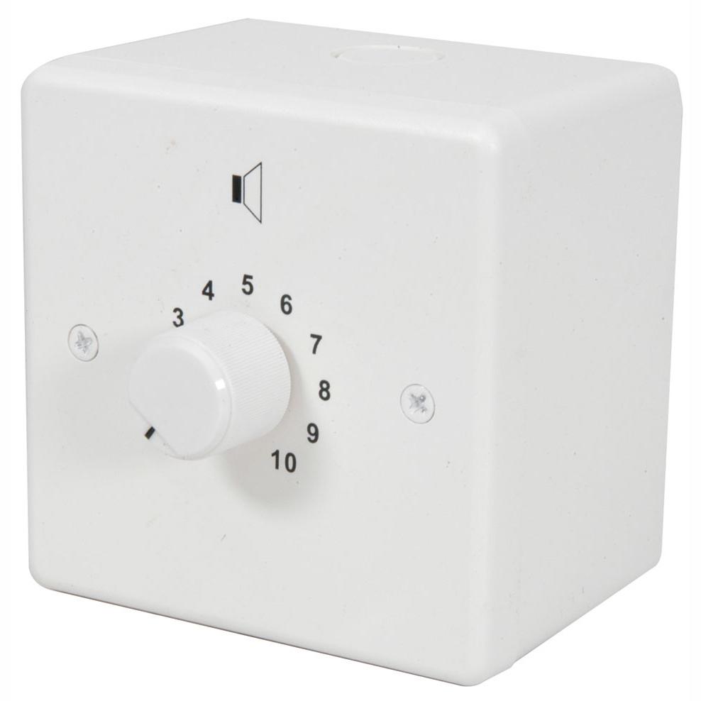 CAS ATT12R is a 12 watt, 100 volt line wall mounted volume control attenuator with a 24V relay to enable bypass to full volume when triggered from a fire alarm panel.