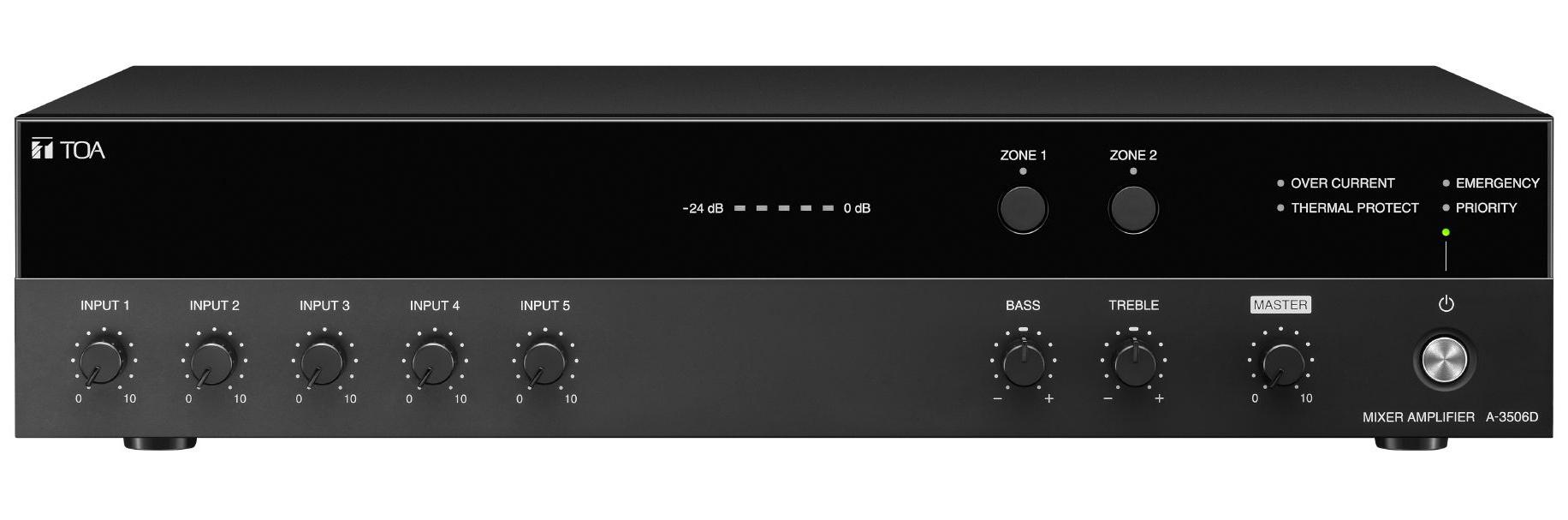 The TOA A-3506D is a class D digital mixer amplifier with a 60 watt output and compatible with 100 volt line or low impedance systems.