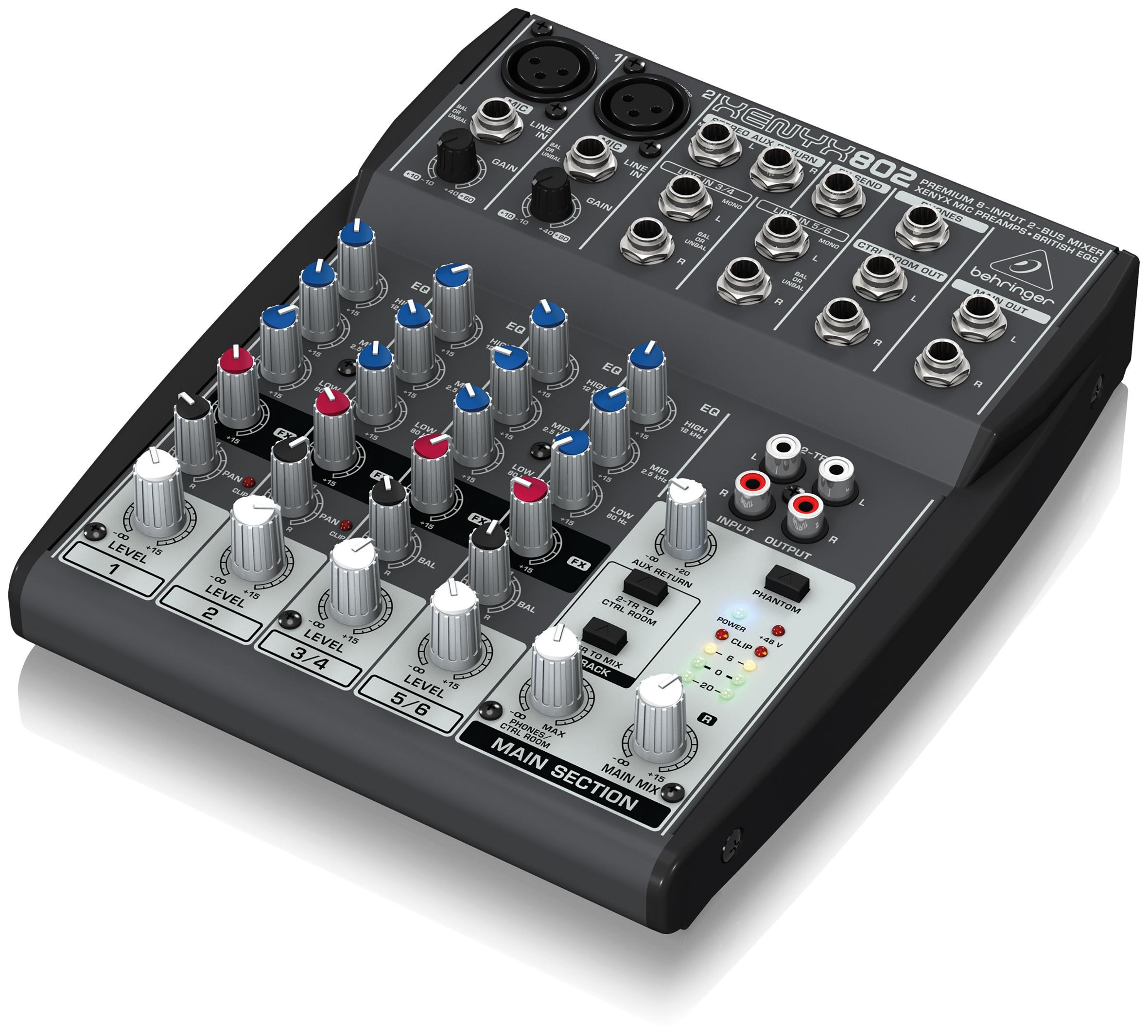 The 8-input, 2-bus XENYX 802 has two XENYX mic preamps with +48 V phantom power, making it possible to use two dynamic or condenser microphones. The three-band British EQ is lauded throughout the sound engineering world for its warm, musical sound. You can use the 802's effects send and return jacks to hook up to an external effects processor.