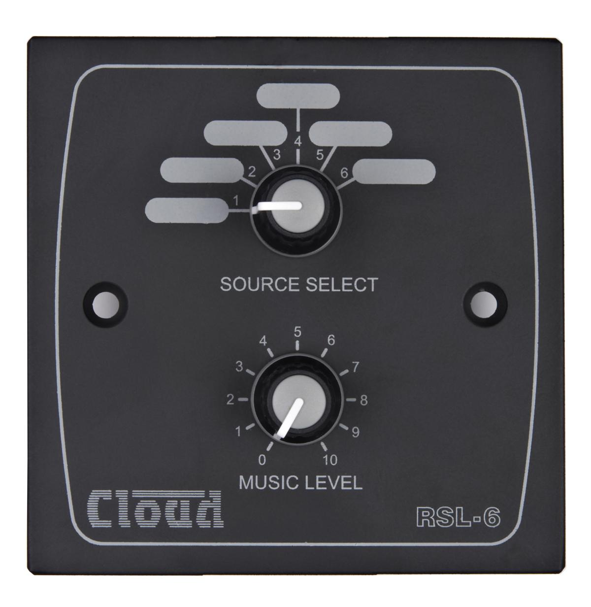 The Cloud Electronics RSL-6B is a single gang electrical faceplate style wall mount controller for a variety of Cloud mixer products. Black finish.