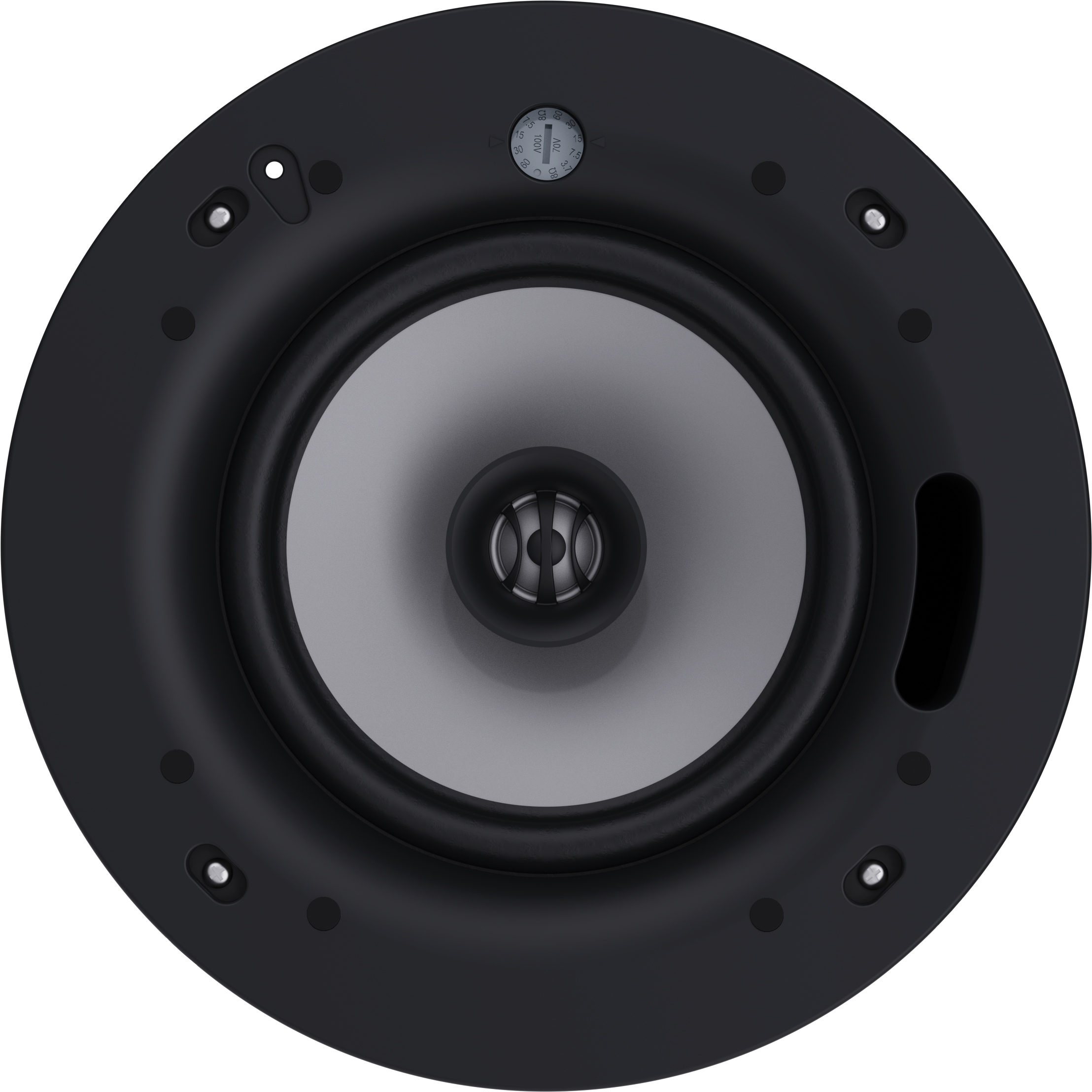 The Electrovoice EVID-C8.2-G2 is a dual impedance 8", two way, coaxial ceiling speaker rated at 60 Watts on 8 Ohm or 70/100V line. Selection is via a convenient switch on the front baffle.