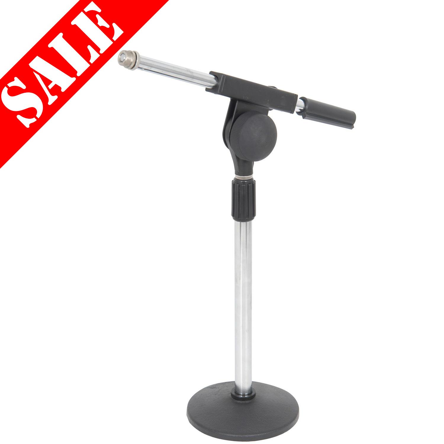 The QTX 952.336 desktop microphone stand with boom arm features a heavy 130mmØ cast iron base with two piece telescopic stem and adjustable boom arm.