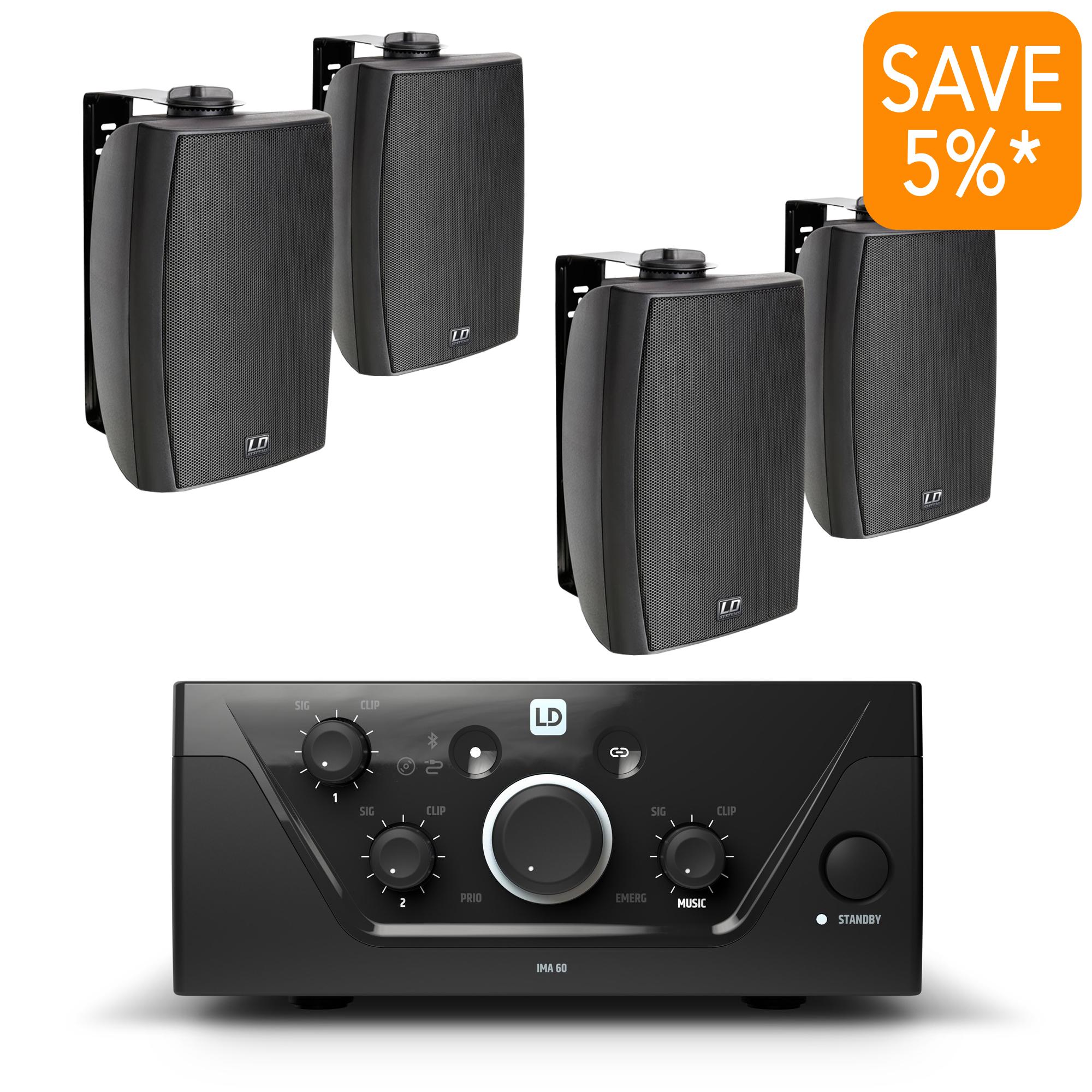 The package includes the LD Systems IMA60 amplifer & four black LD Systems CWMS 52 100V cabinet loudspeakers (tapped at 10 watts) in black.