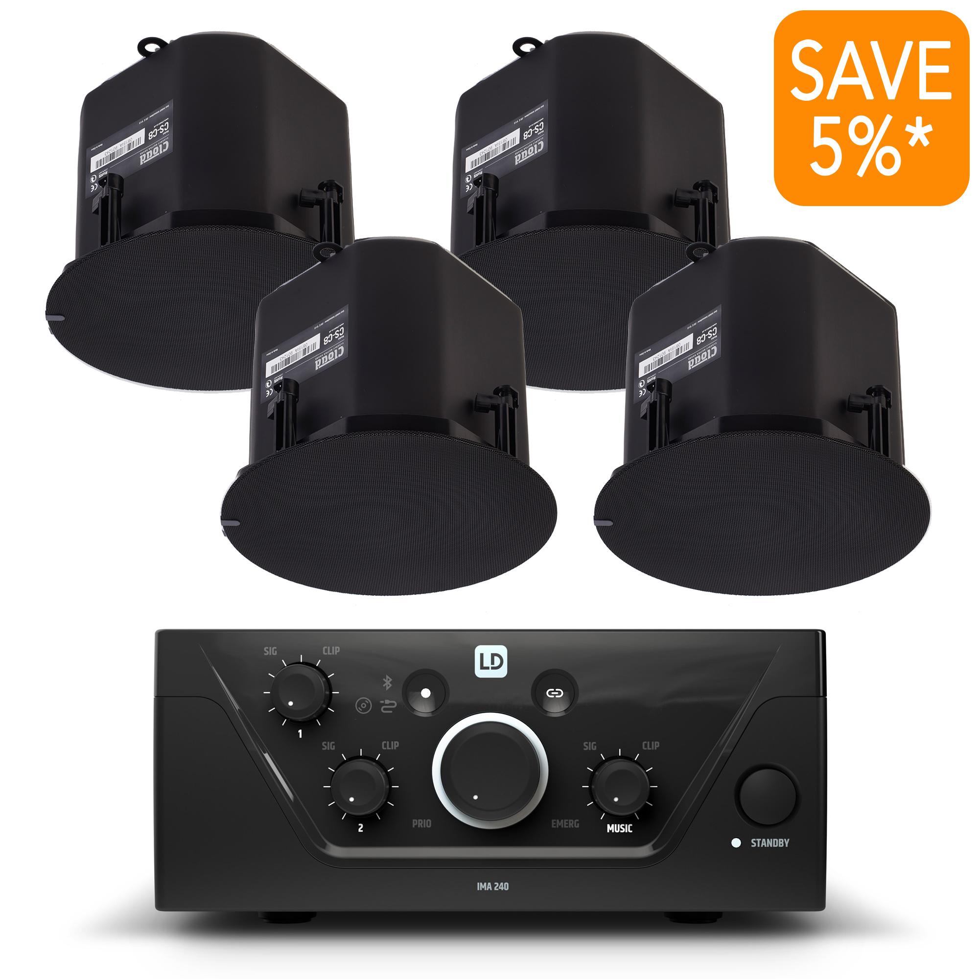 The package includes the LD Systems IMA240 amplifer & four Cloud CS-C8 ceiling speakers in black, each tapped at 16 Ohms.
