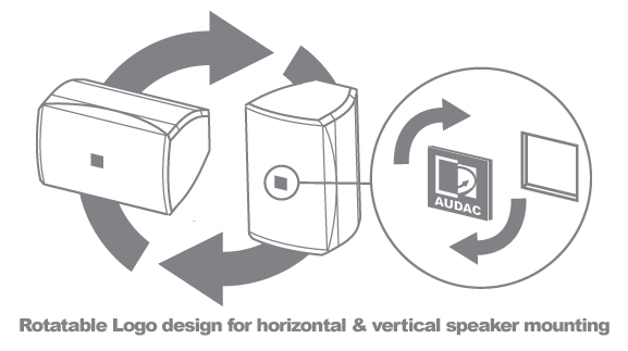 The speaker can be mounted horizontally or vertically and the badge can be rotated to suit.