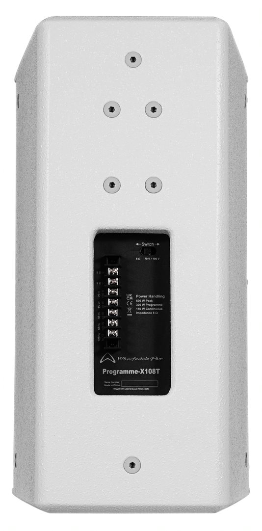 The Wharfedale Pro Programme-X108T 2 way, 8" loudspeaker is rated at 120 watts, 100 volt line and is ideal for foreground or background music in demanding environments such as airports, churches, schools, retail shops, restaurants, pubs and bars.
