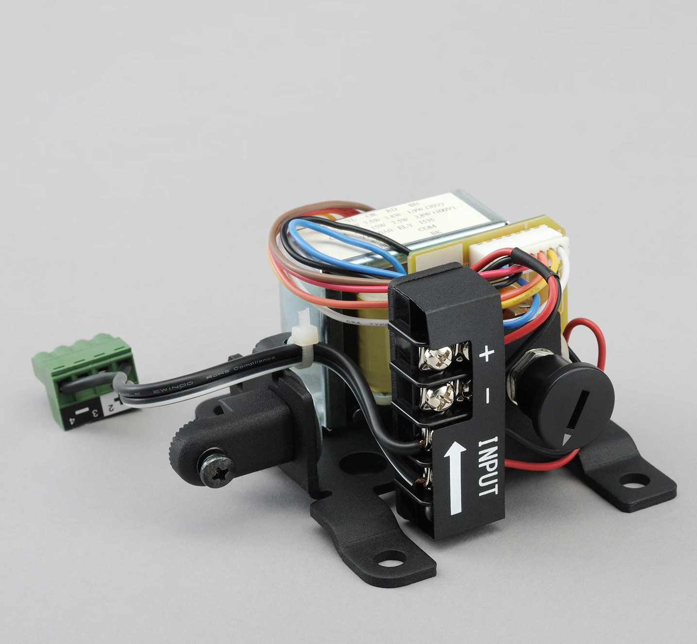 Tappings are available at 15, 7.5 and 3.8 watts and are selected via the rotary dial on the mounting bracket.