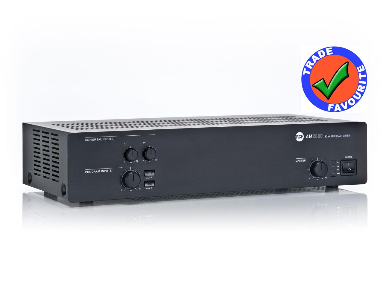 The RCF AM 2080, one of our favourite products, is an 80 watt mixer-amplifier suitable for use on 70 / 100 volt line distributed sound systems or low impedance (4Ω) music systems.