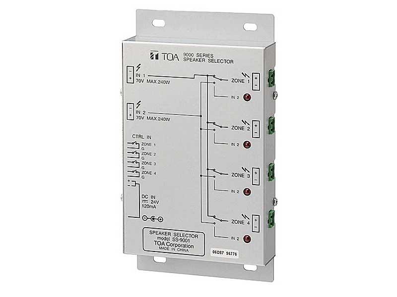 The TOA SS-9001 is a speaker selector for use with the ZP-001T zone paging module. The SS9001 outputs 2 input signals to 4 different zones.