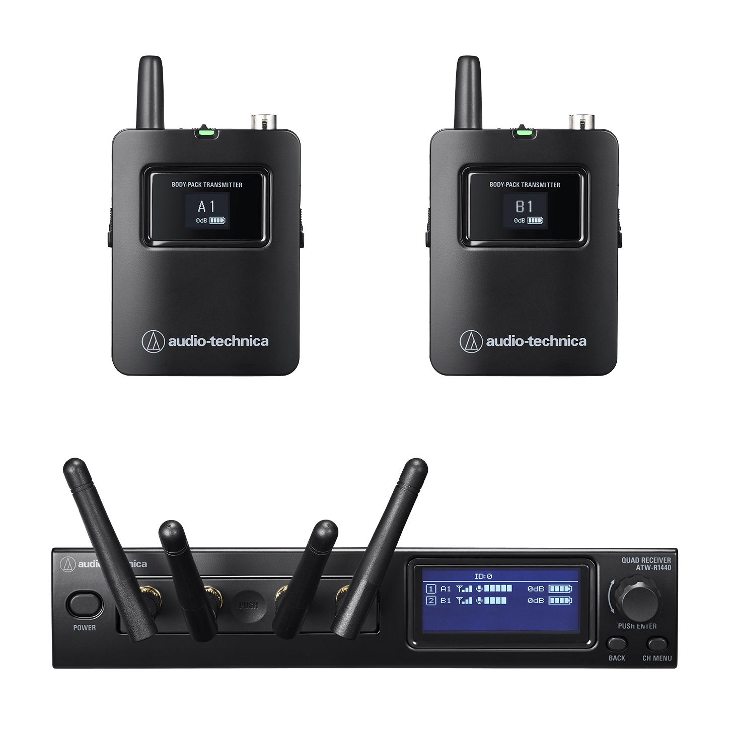 The system consists of one Audio Technica ATW-R1440 wireless microphone quad receiver and two Audio Technica ATW-T1401 bodypack transmitters*.
