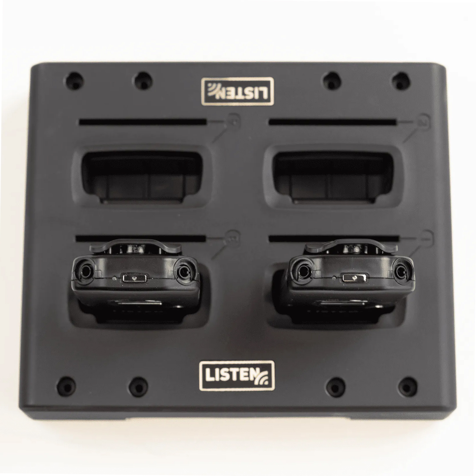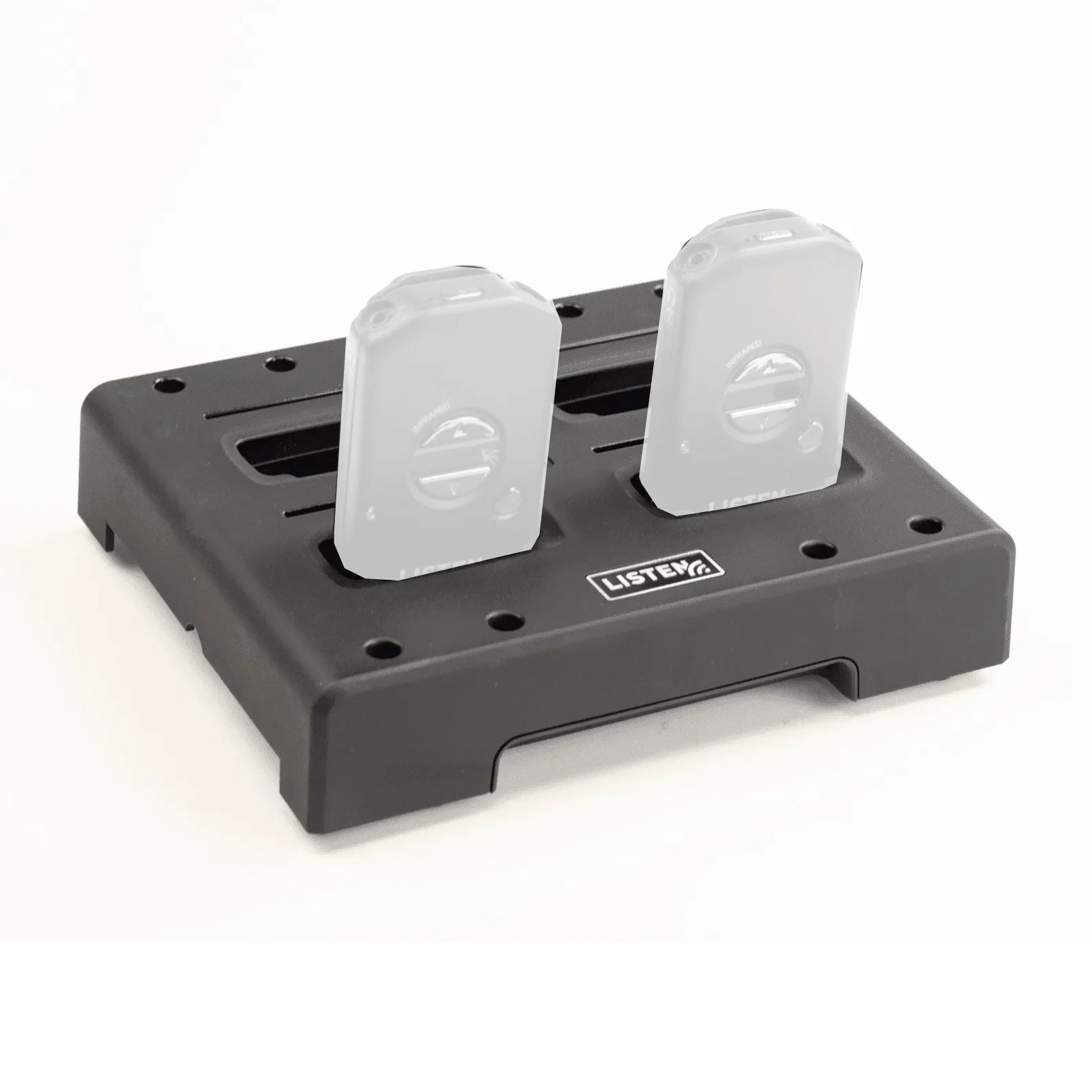 The LA-384 intelligent 4-bay charging tray enables up to four individual Listen iDSP (Intelligent Digital Signal Processing) infrared receivers to be charged, stored, dispensed and collected in one handy unit.