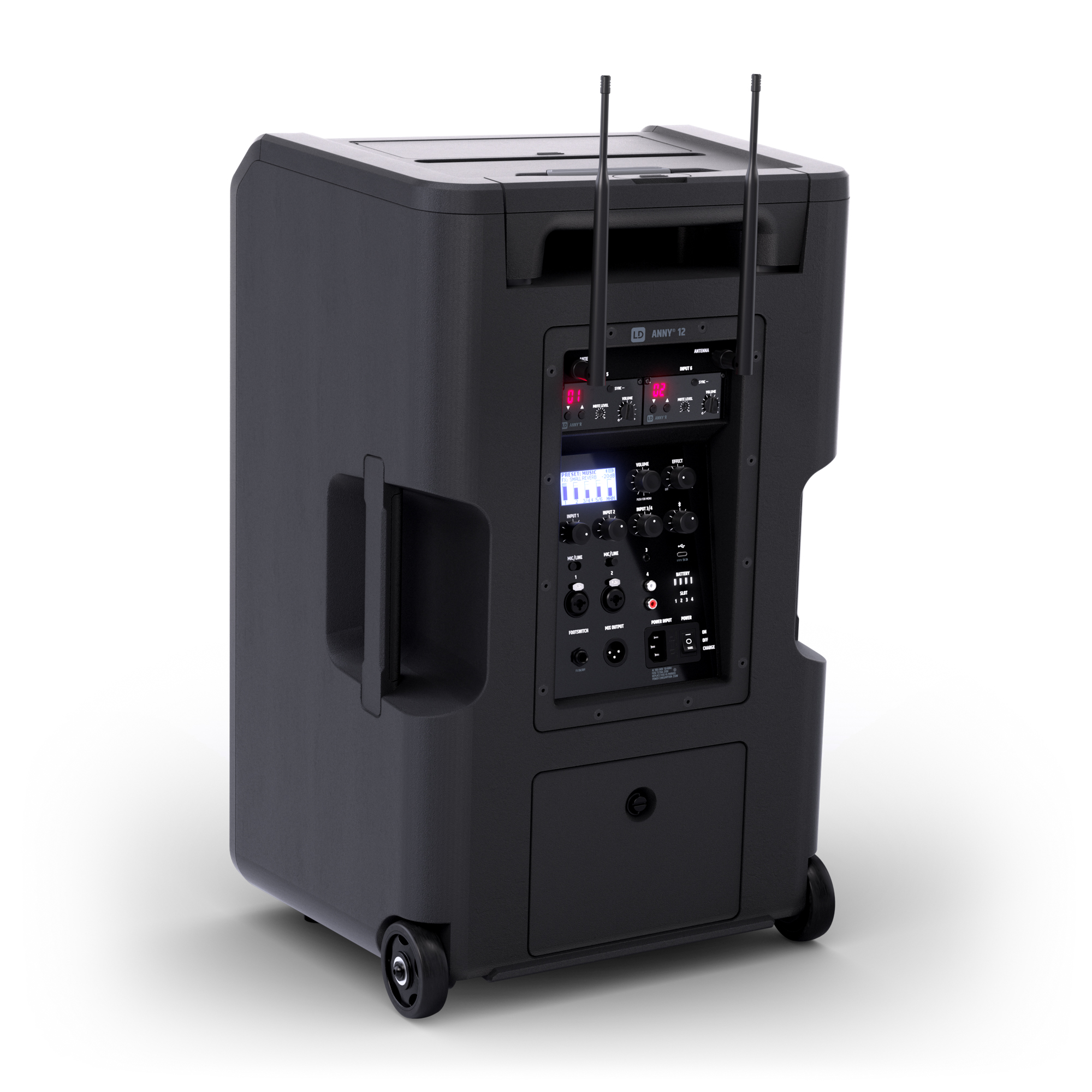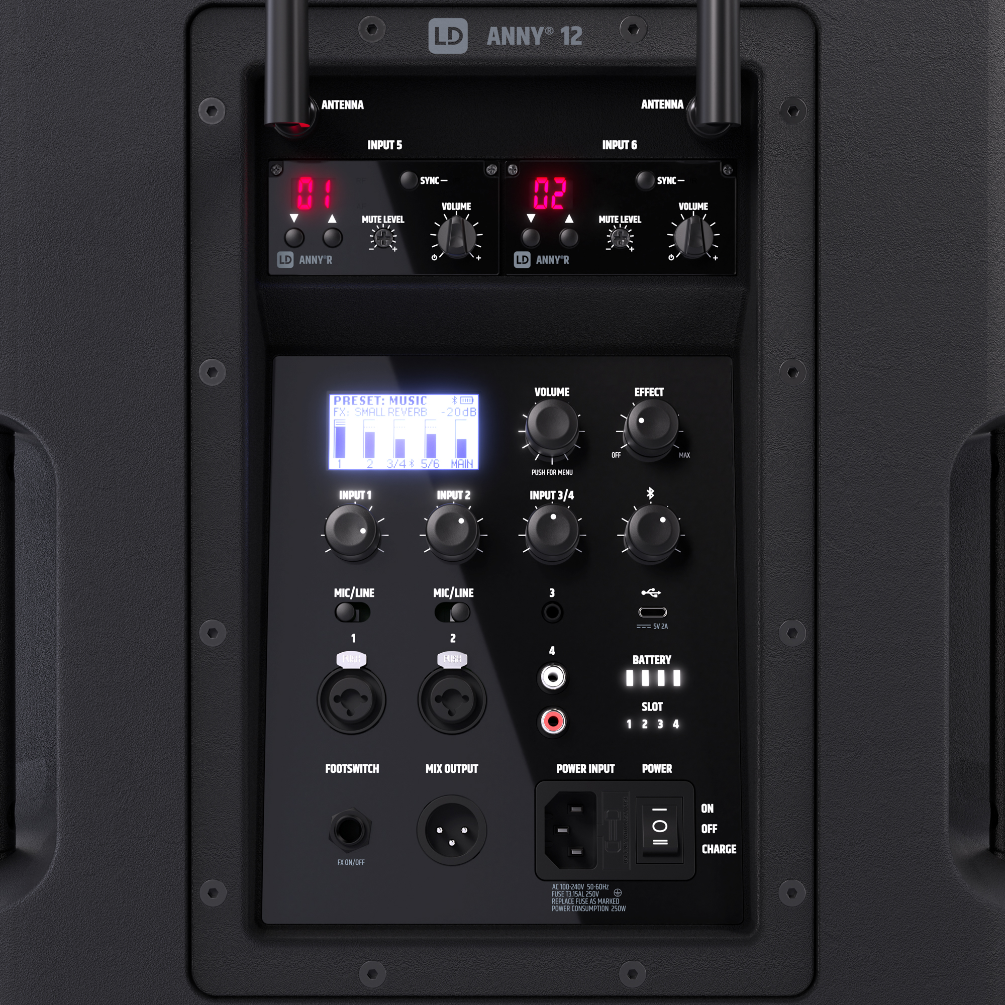 The 4 batteries and the hot-swap function mean that ANNY 12 can be used continuously and without interruption. As long as one of the four batteries is plugged in, ANNY will continue to play at full power, so the empty batteries can simply be swapped with fully charged ones during operation or charged alternately.