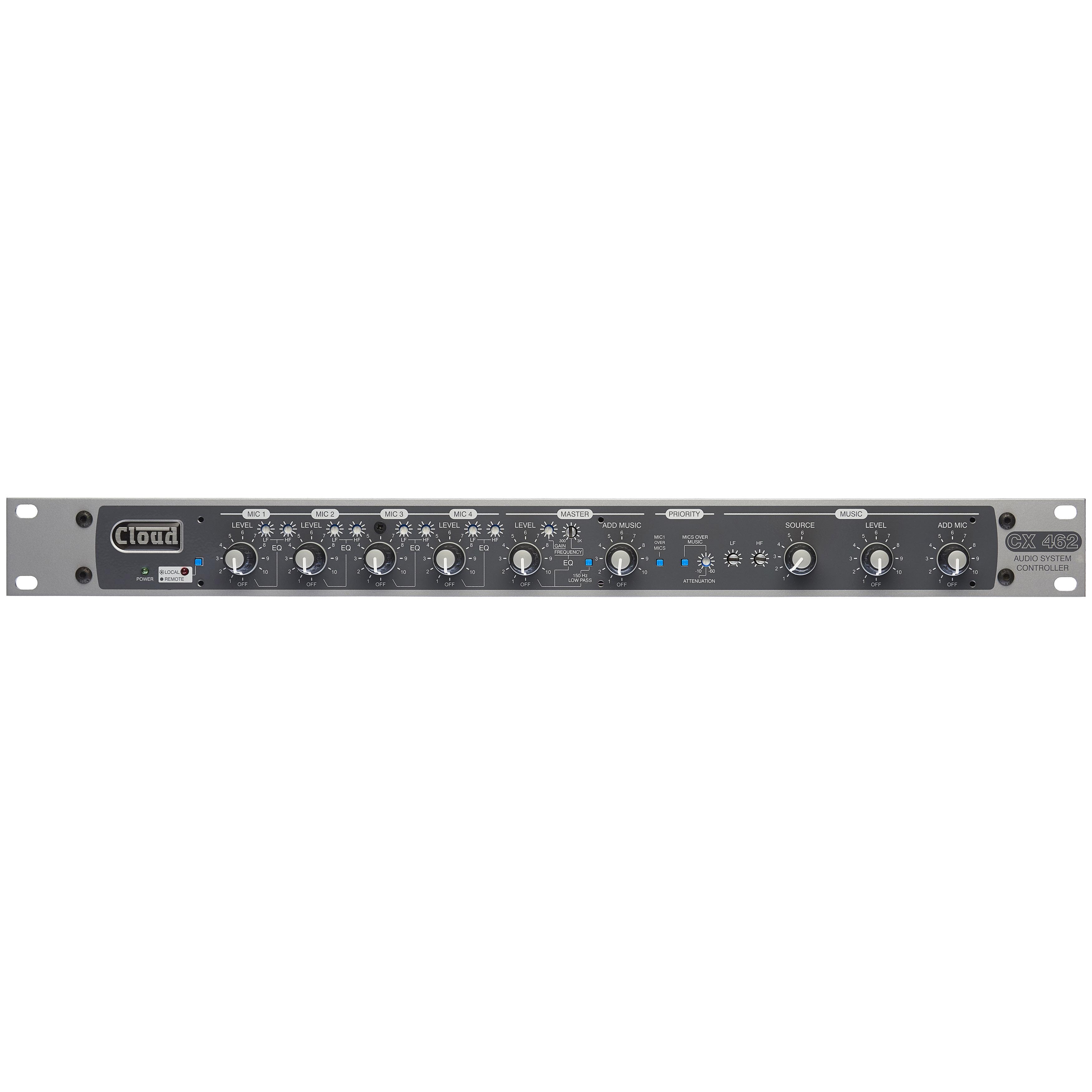 The Cloud Electronics CX462 stereo audio mixer with independent music and microphone sections featuring 6 line inputs with preset gain controls in the music section and 4 microphone inputs in the mic section.