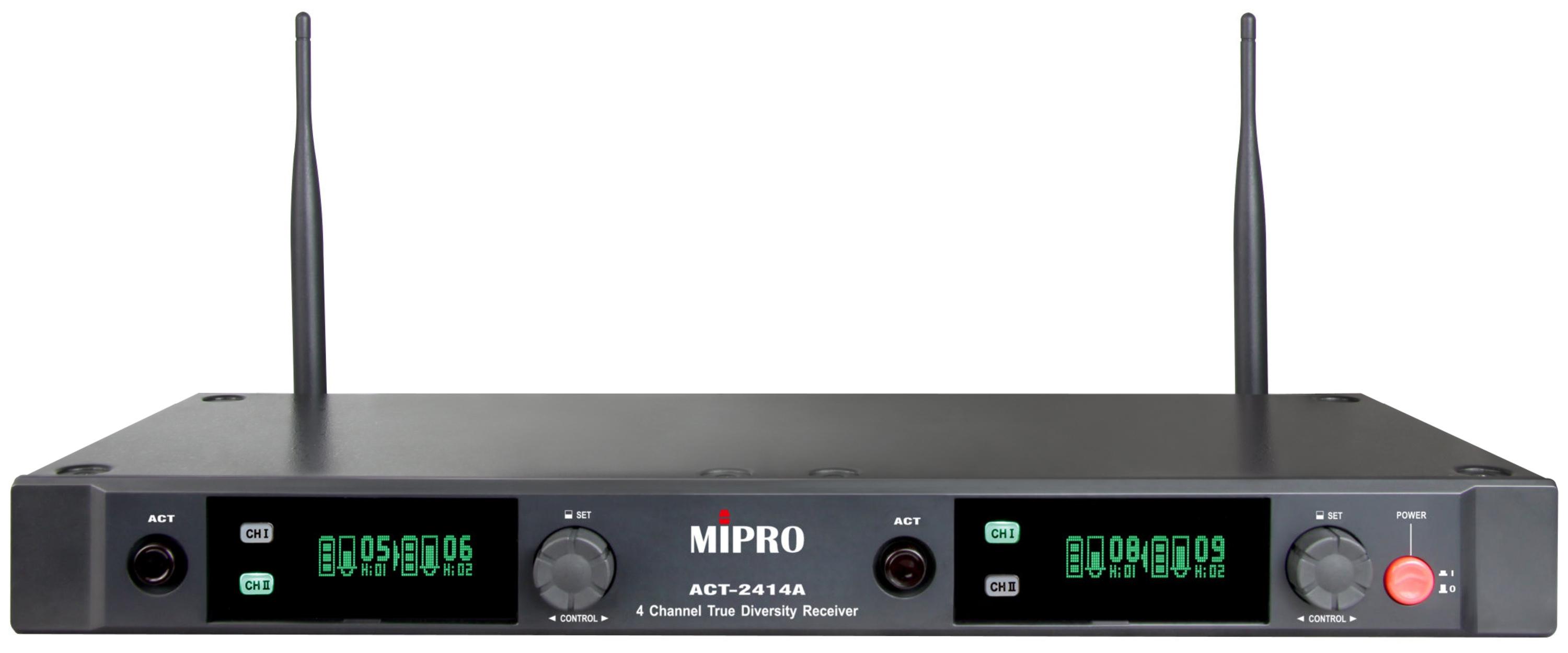 The Mipro ACT-2414A quad channel digital wireless microphone receiver is one of our favourite products. It operates in the licence free 2.4GHz band with true diversity reception and offers a range of up to 100m.