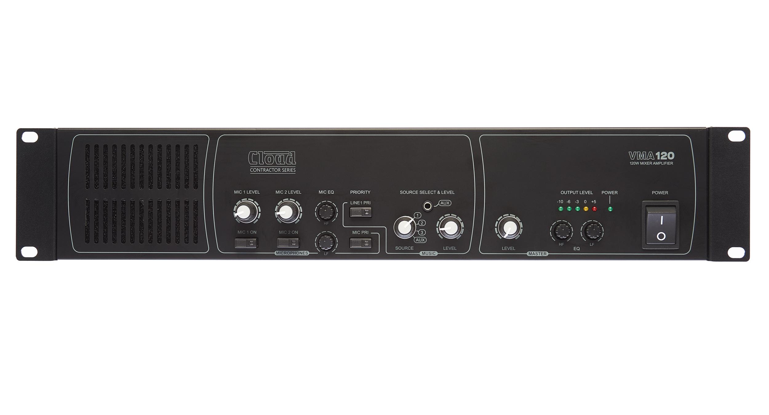 The Cloud Electronics VMA120 is a 120 watt mixer amplifier for use on low impedance audio systems (4 ohms minimum) or 25 / 70 / 100 volt line distributed sound systems.